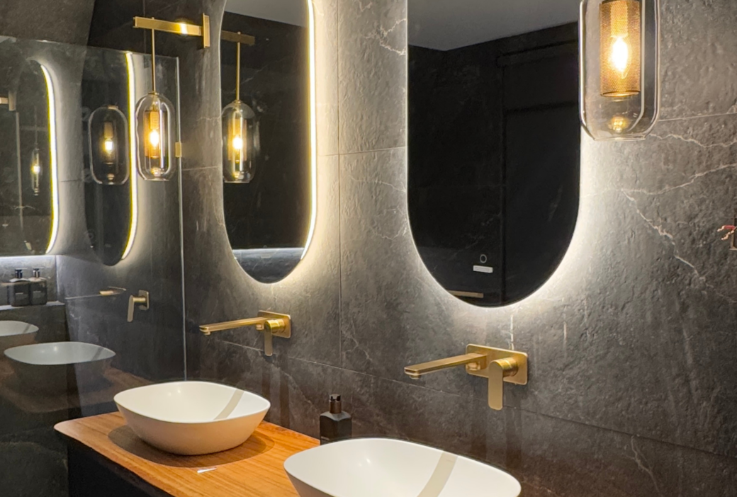 - Luxury bathroom with designer fittings, luxe products, and views of nature